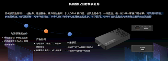 创维数字与上海海思深度合作,开发了基于GPMI接口的插入式微型机顶盒解决方案。